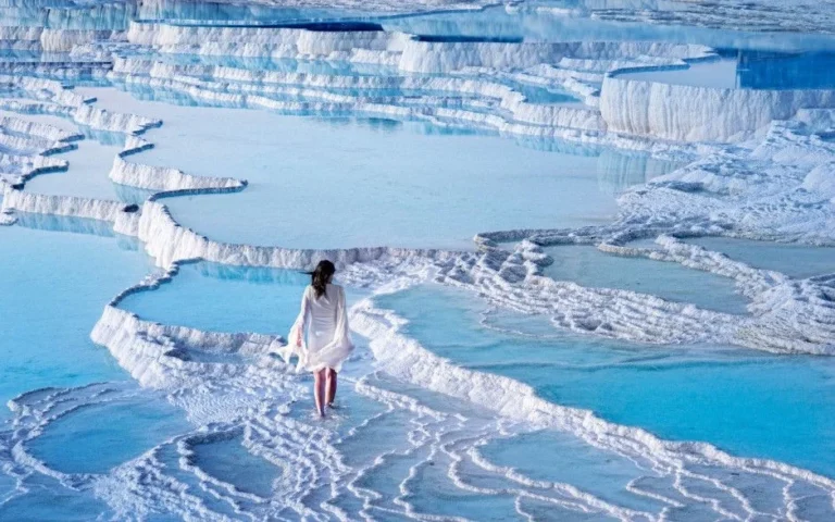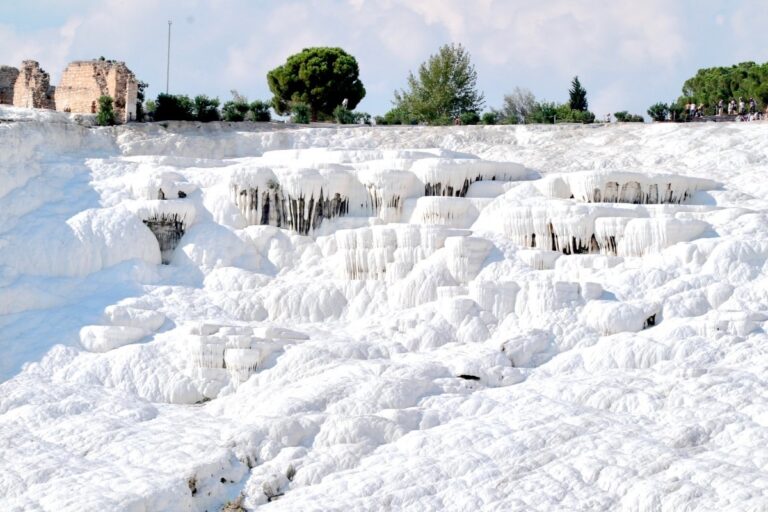 棉花堡自然奇景(Pamukkale):以白色石灰岩梯田聞名,層層疊疊如棉花般閃亮。1988年與希拉波利斯古城一同列入世界遺產,溫泉與美景並存。